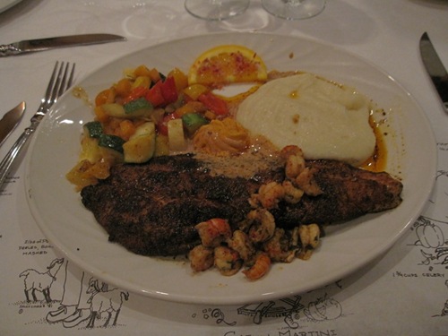 I decided to pass on an entree. Honestly, I could have just had bread, wine and salad and been perfectly satisfied!!! The Vega bar held me over really well (and the beer helped ๐ ) So Matt and I split the Blackened Drum Fish for an entree. It was good, but waaaay too salty. Hope it wasn’t that blackening seasoning!