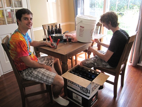 Our kitchen is a beer factory at the moment – the boys are bottling their latest brew.