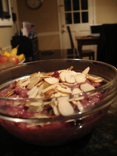 At 6:00 I whipped up a batch of oatmeal – and decided to use frozen mixed berries for a change. It was berry delicious, but not nearly as good as the banana oatmeal. I think since berries have a higher water content they water down the oats, whereas banana seems to emulsify in to make them even creamier than starting. I used to have blueberries or raspberries (frozen and fresh) in my breakfast all the time, but I do that more in the summer because my body is craving those seasonal fruits that time of year??