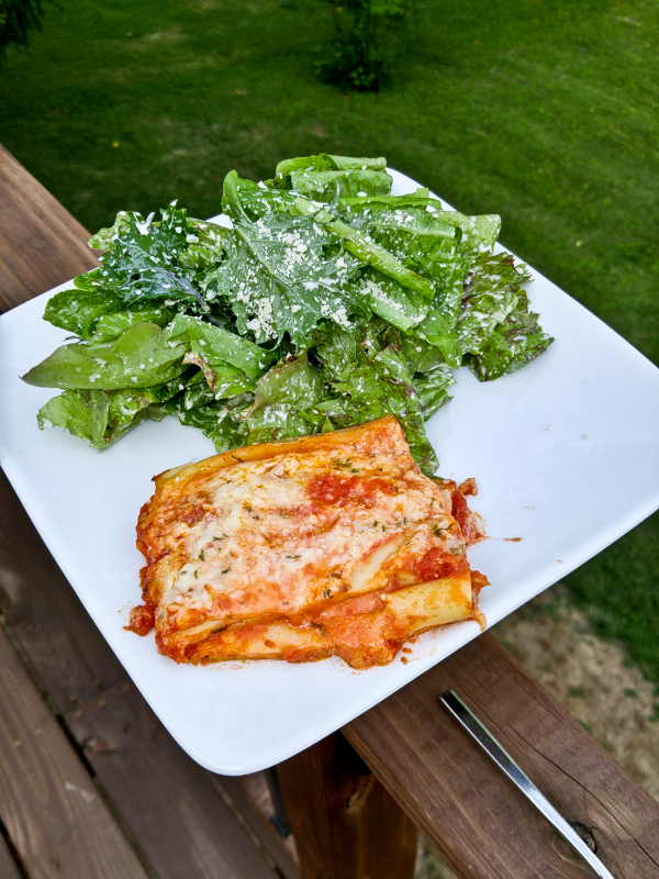 I had planned a crockpot dinner, but that got pushed aside, so we pulled a lasagna out of the freezer and had that with a salad from our garden topped with Caesar dressing and parmesan cheese.