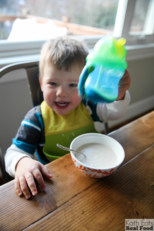 A mix of banana, oats, greek yogurt, milk and peanut butter. My little bed head boy!