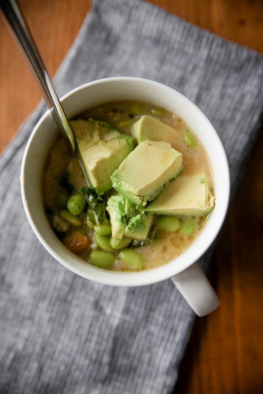 THIS lunch!! I had leftover coconut rice, vegetable broth, frozen edamame, miso and avocado and turned it all into an amazing lunch soup on the spot.