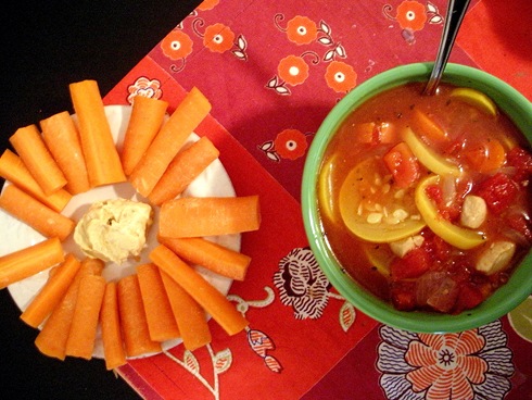 -4 carrots all chopped up with 1.5 TBS Sabra’s Supremely Spicy Hummus. I usually enjoy whipping up my own hummus but I couldn’t resist the Sabra sale and my hummus never tastes that exquisite!
