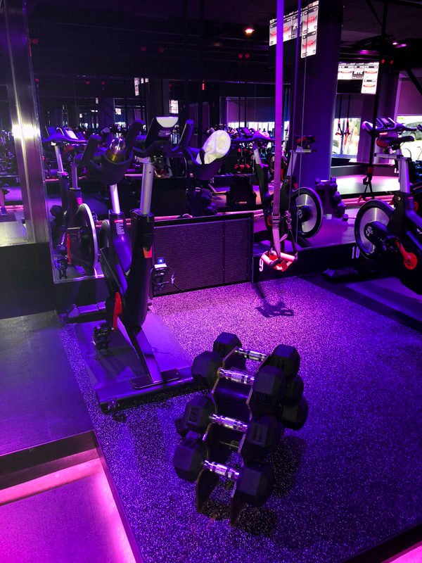 The class was cool because the studio was dark and the lights gave the room a club effect. I love workout classes in the dark, especially first thing in the morning! We wore MyZone heart rate monitors (we have these at my home gym too!) and used a mounted computer screen plus the light-up bike to motivate us to push into the highest zones. Only about 25% of the class was on the bike, and the rest was done in “boxes” where we had TRX, weights, and room for plyo and planks.