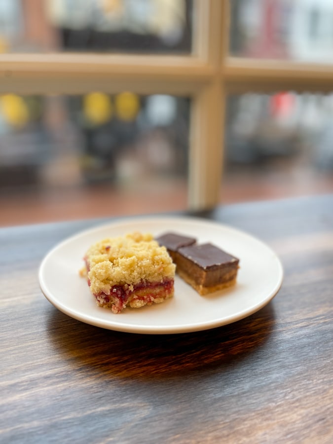 To finish our lunch, we shared two different bars – the Jam Bar with a shortbread crust, raspberry jam, and crumble, and the Almond Layer Bar from Bowerbird Bakeshop. I believe both were vegan. And both were so good!