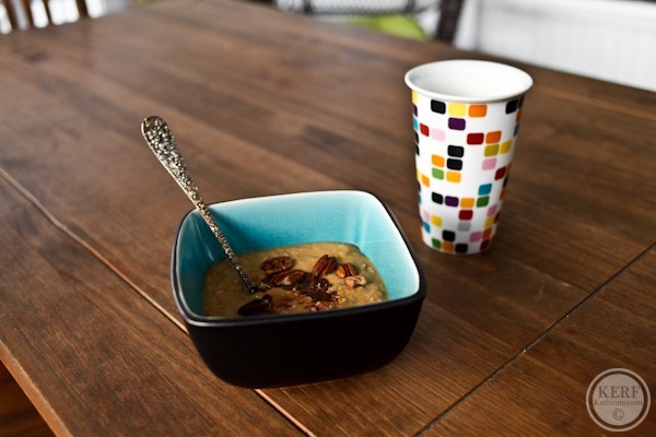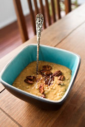 Just a bowl of Coach’s Oats with pumpkin stirred in and some Justin’s Chocolate Almond and Barney Butter swirl on top. Plus spiced pecans!