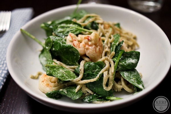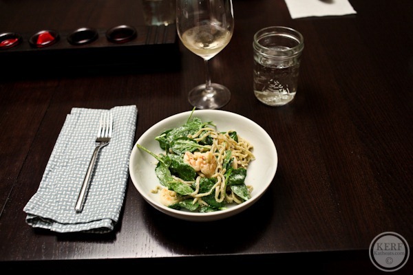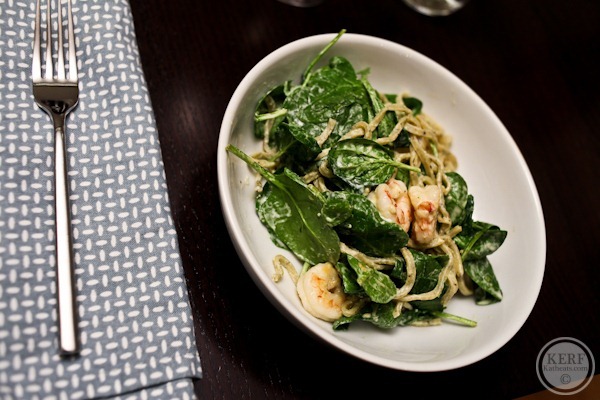 Fresh Mona Lisa Pasta (ok, I had regular whole wheat in mind but Karen surprised us with the fresh kind!) with sautéed shrimp, wilted spinach and Uniquely Greek feta spinach spread as a creamy sauce. We just stirred the sauce in with a dash of hot pasta water and it turned into a nice creamy sauce in seconds.