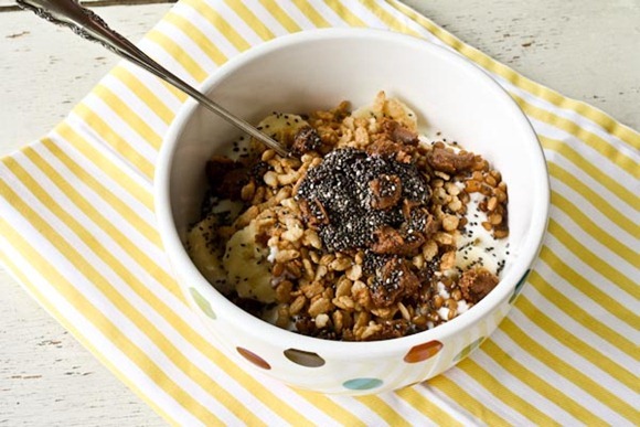 Topped with wheatberries (lots!), brown rice puffs (which I am really enjoying much more than I thought I would!), half a banana, 1 tsp jam, chai seeds and crumbles of Flying Squirrel PB – Cinnamon (which is dry enough to crumble and worked really well in this bowl!)