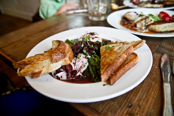 Finally we shared the eggs meurette – eggs poached in Burgundy wine, with sautéed shiitake mushrooms asparagus, applewood bacon, crostini.