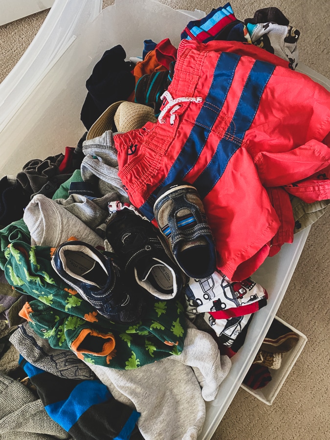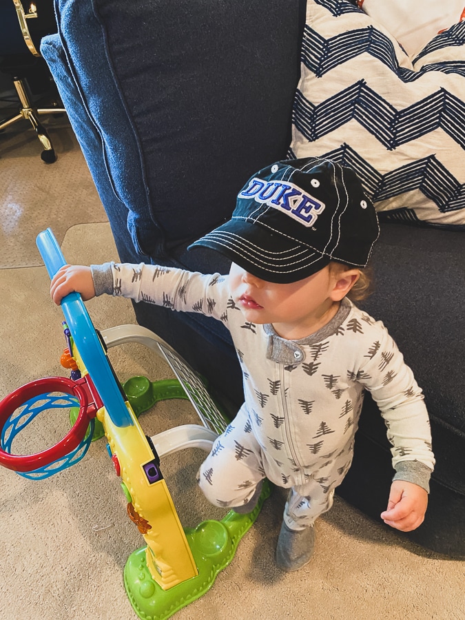 I spent a little time getting Mazen’s old 1-2 year old clothes out of storage for Birch. Thomas is H O R R I F I E D by the Duke hat