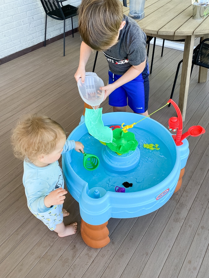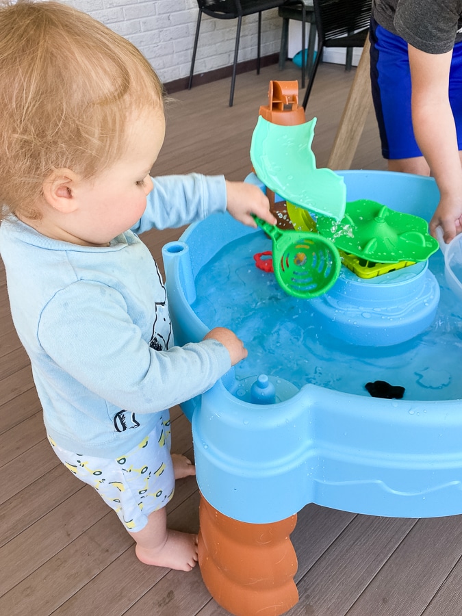 We have a new water table thanks to Grammie Buzz! She got us this one, and it’s been nice to keep the water table on the porch now that warmer weather has arrived. We’ve been playing with it nearly every afternoon. On chilly days, I fill it with warm water, and this summer I’m sure some ice will be nice.