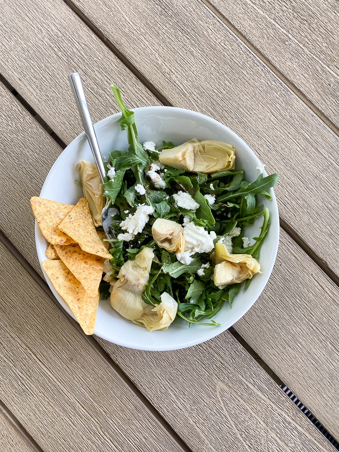 An arugula salad with artichokes, feta, currants, aged balsamic and chips. Why does it look small? Because I had half a kids quesadilla before lunch!