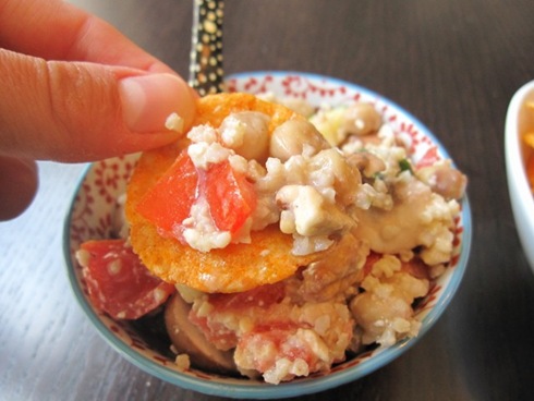 I enjoyed dipping it with Popchips so much yesterday that I had my last bag, BBQ, as dippers. The flavor combo was a bit mis-matched, but it still worked.
