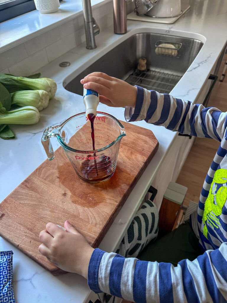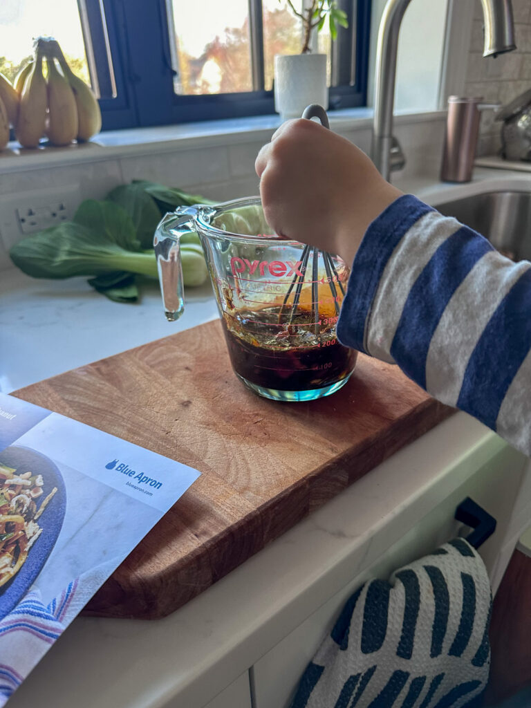I try to involve the kids in the kitchen whenever I can, and Birch is at that sweet spot age. While Mazen has reached “make your own quesadilla” status, Birch loves to help me with Blue Apron recipes. Recently we made this udon noodle recipe together. I usually get him to help the most with prep steps and then he goes off to play when the hot cooking starts.
