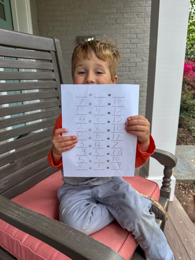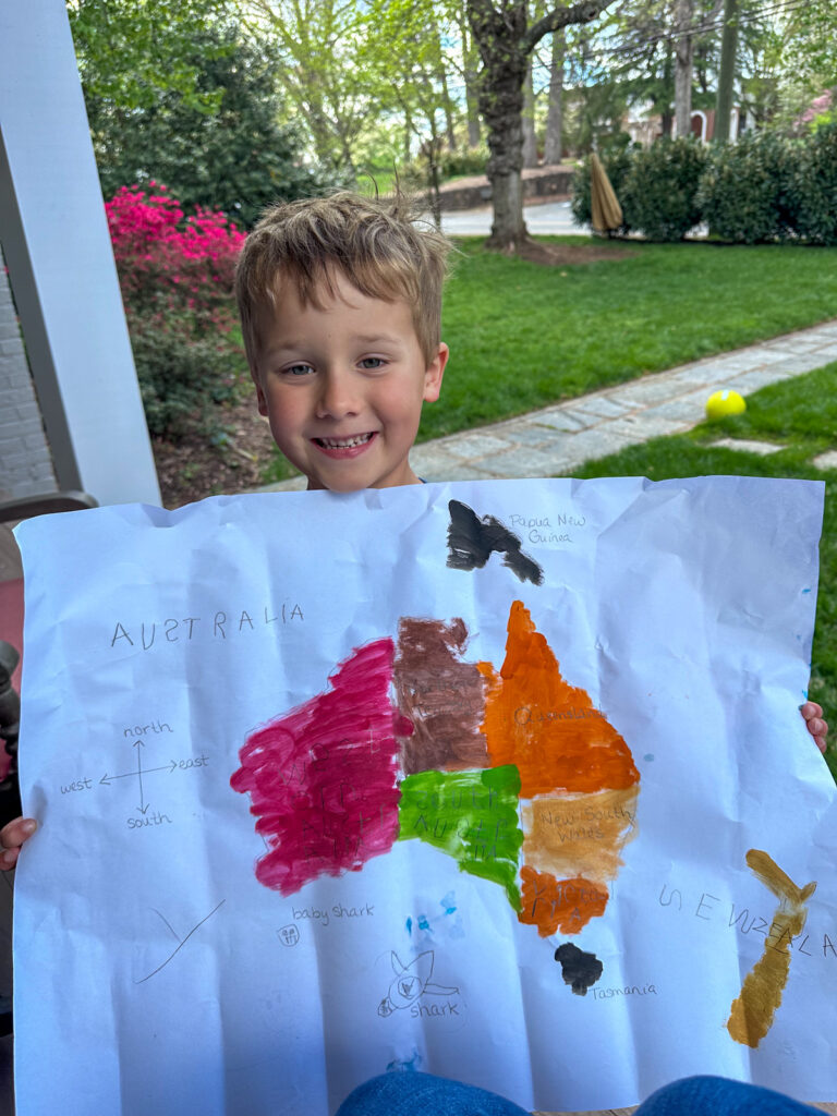 Check out the projects Birch brought home from school! His first addition worksheet and the continent of Australia.
