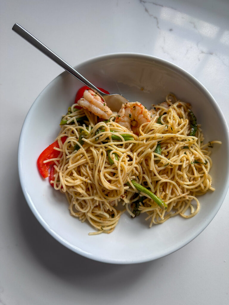 This time he helped me chop mushrooms using a dull butter knife and then prepare the peanut butter sauce for the noodles.
