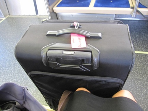 Your 43 pound suitcase WILL fall over. Hold it tight with your legs