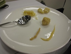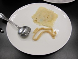 My taste testing included a sample of each kind of pasta: 3-cheese, gnocchi, a matzo ball, raw noodle dough. Plus a ravoili and more noodles. I sampled more than you see here – 5 more pieces?