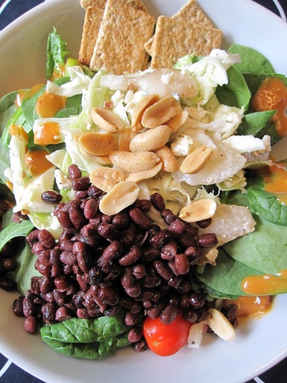 Greens, Annie’s Woodstock, tomatoes, carrot, green pepper, 1/3 cup beans, leftover blue cheese slaw, peanuts.