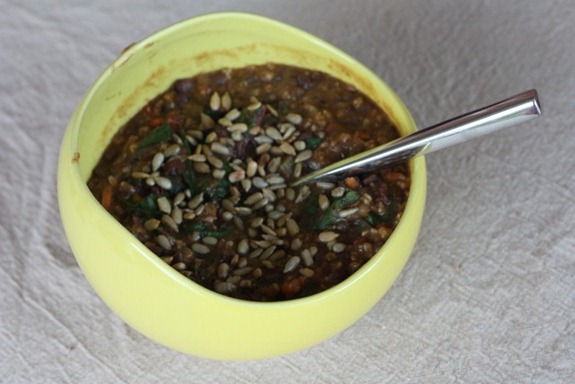 Topped with sunflower seeds. With pillows of swiss chard floating around.