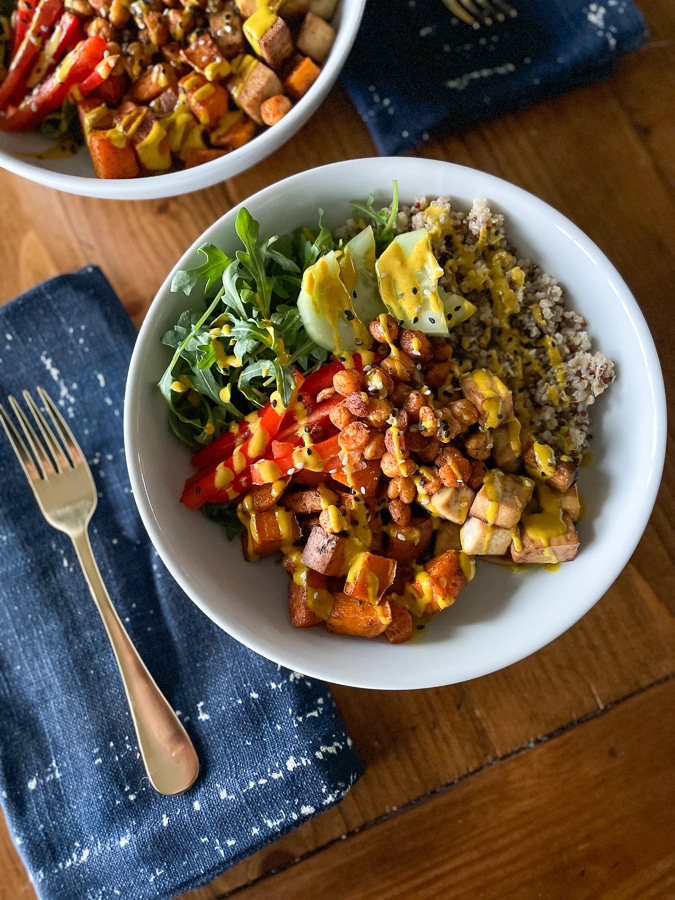 This recipe has a few steps to it, but they are all simple steps and are easy to do in advance on prep day or as you’re doing daily routine chores. Most of the recipe time is hands off. To save time, prepare quinoa in a rice cooker. And roast your potatoes, tofu, and beans the morning of.