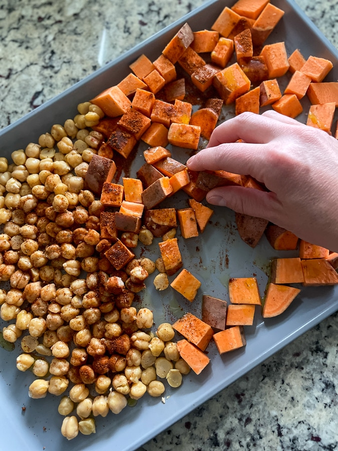 - Arrange chickpeas and sweet potato on a baking sheet and season with olive oil, spice blend, salt and pepper. Arrange tofu on a separate smaller baking sheet lined with parchment.
