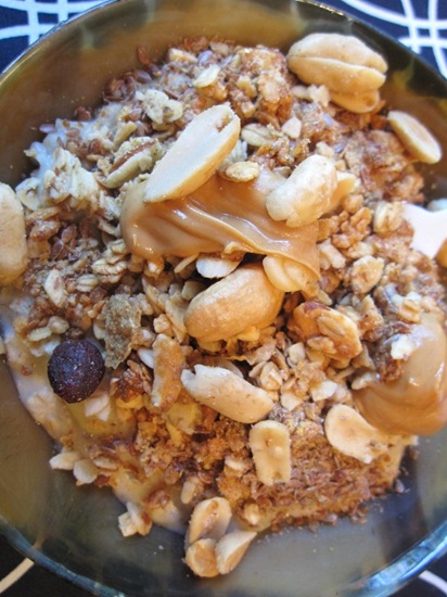On top of a simple whipped banana oat base with some flax, a few extra salted peanuts, and Jif Natural PB (blobbed on top). I am not a big fan of the Jif Natural. I only have it leftover from yesterday’s tasting. It’s super candy-like – just like the original Jif, so if you have a husband/boyfriend/friend who will only eat classic Jif, I bet they will love this one.
