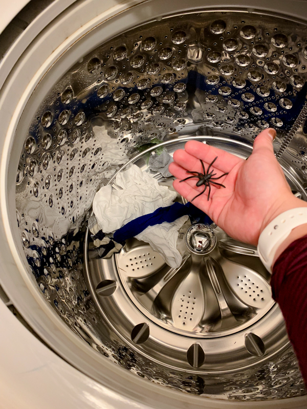 We also decorated the house for Halloween (early, but he was begging me to do it so why not?) and we put most of the decorations in his room, including a ton of these plastic spider rings. I found one in the bottom of the washing machine and it sure made me jump!