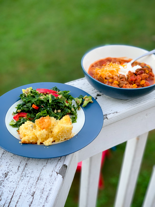 On Saturday night we went to our friends’ house for a chili dinner – how appropriate! I made a version of this sesame kale salad with red pepper, avocado, and sunflower seeds. The chili and cornbread were spot on for the weather!