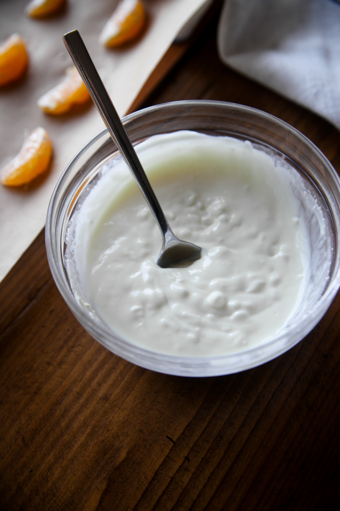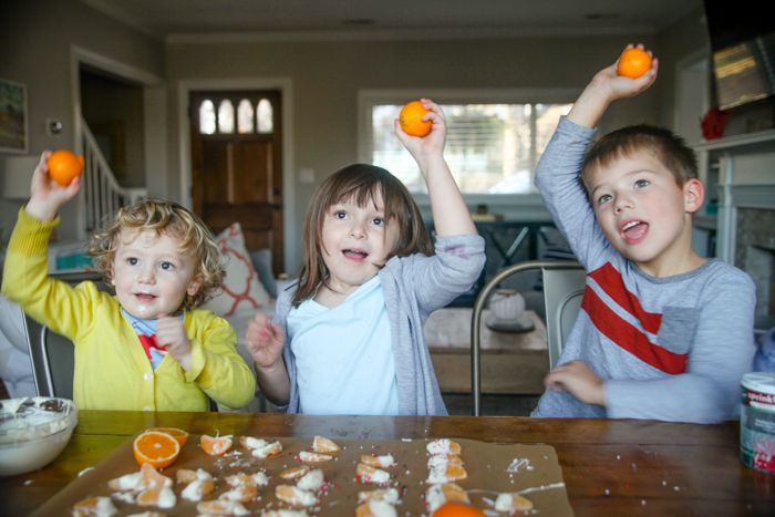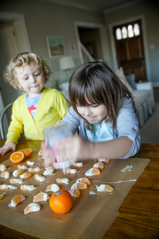 I melted a bunch of white chocolate chips with two tablespoons of coconut oil (so the shell would harden on the citrus) in the microwave for about a minute, stirring every 20 seconds or so. You could totally do this with dark chocolate chips too, but I wanted to keep the mess in the light-colored family! : )