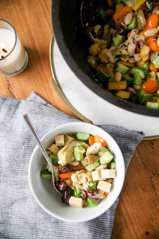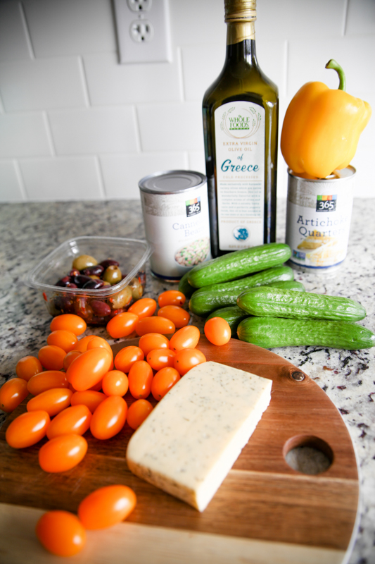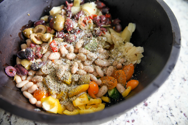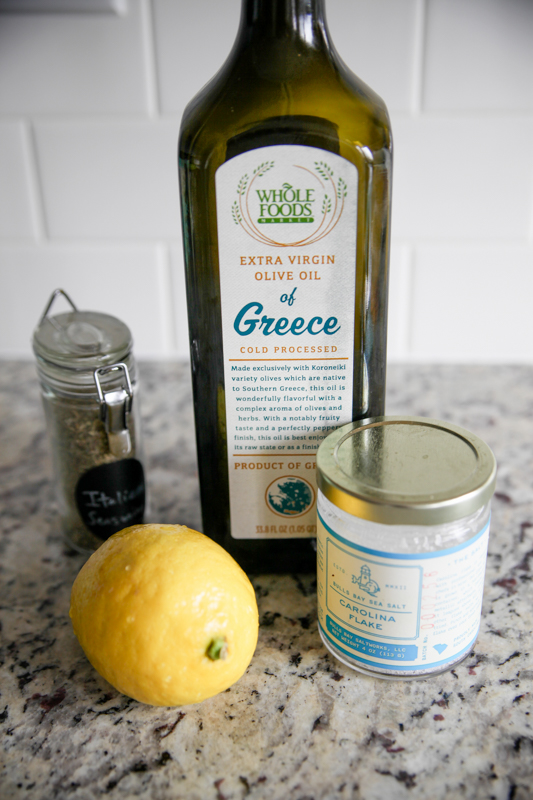 The dressing is a mix of olive oil, lemon juice, Italian seasoning, salt and pepper. Simple and bright!