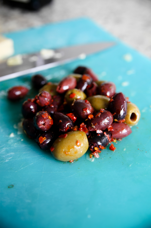 Only high quality olives will do in this case. I love kalamatas and got a mix of different ones from the olive bar at Whole Foods that were seasoned with some red pepper flakes which made the recipe extra spicy. Already pitted a plus!