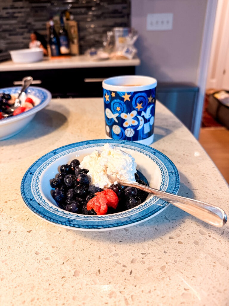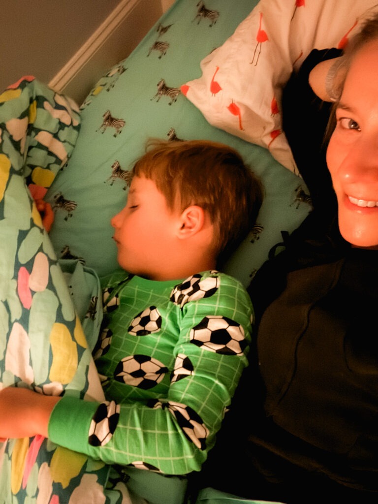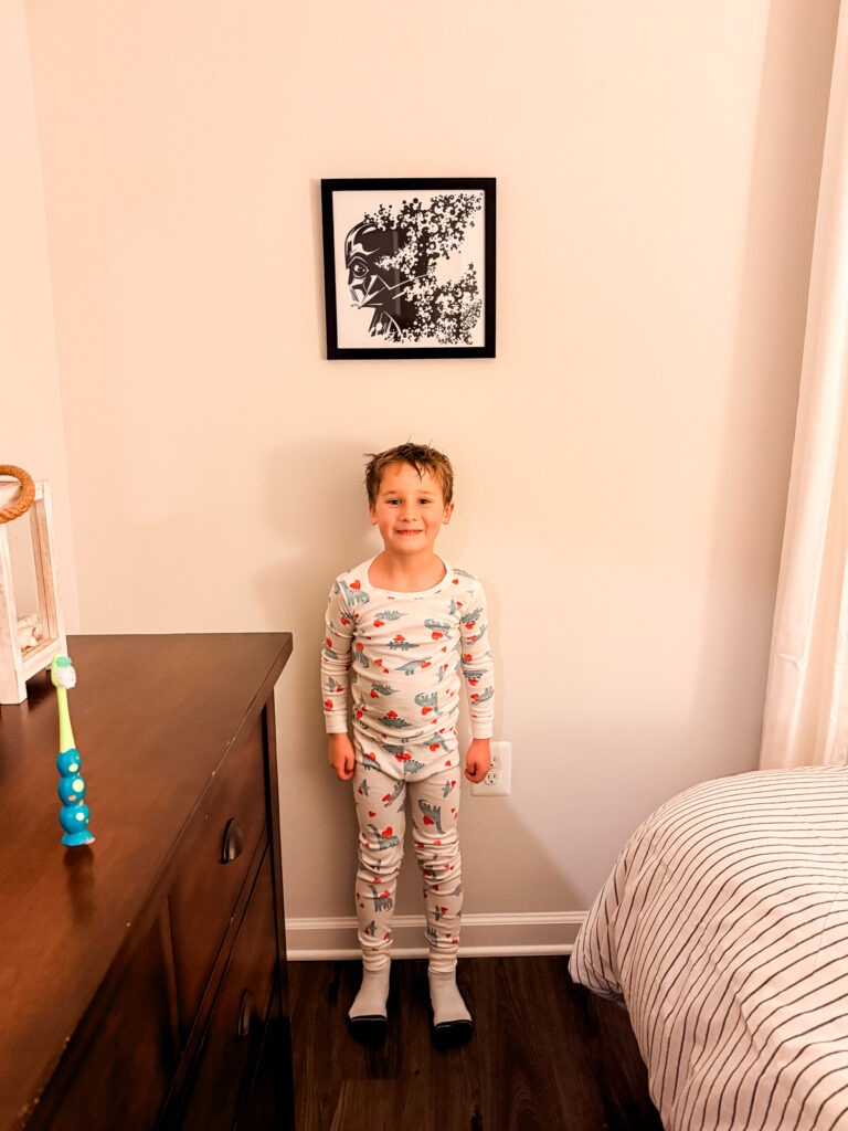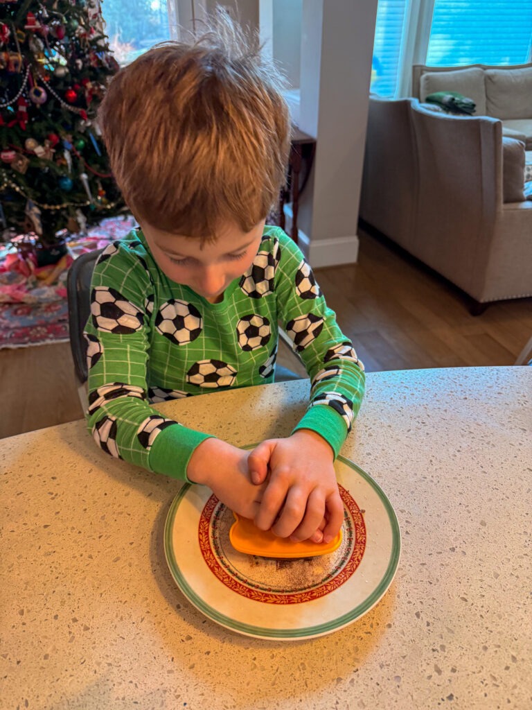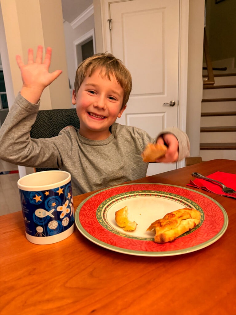 The next morning Birch couldn’t wait to have Grammie toast. We’ve had this smile maker for 30+ years. (Soccer jams are new from Old Navy!)