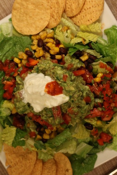 To celebrate the salsa, we made taco salads with black beans + corn (heated in the microwave with some cumin and more of the above seasonings), a bed of romaine, lots of fresh guacamole (made with the salsa) and some greek yogurt and hot sauce on top.