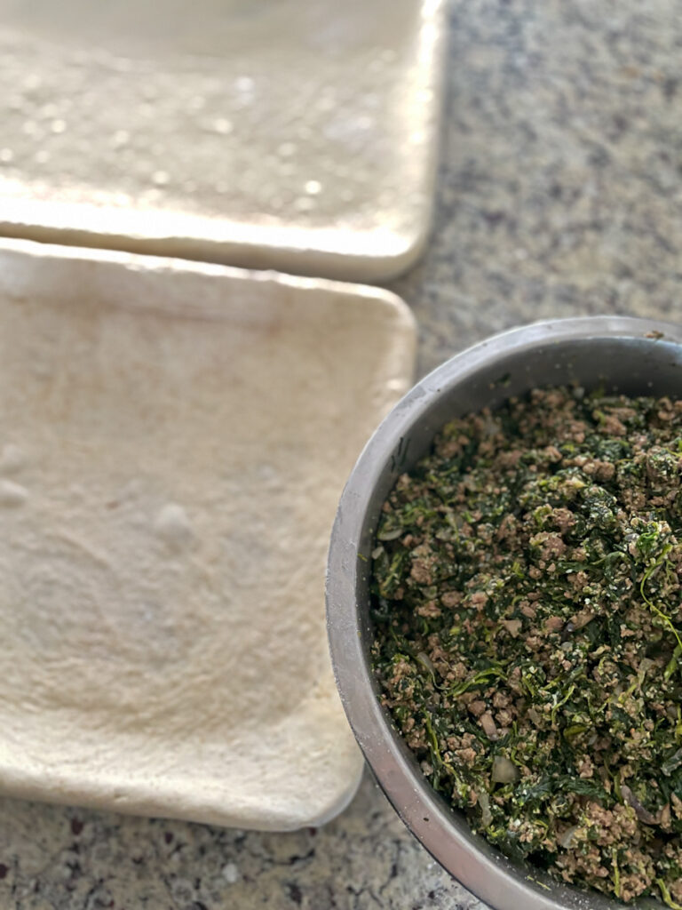 Heat bagged spinach until well thawed and warm. It just needs to be thawed, not necessarily cooked much beyond that. You can heat it in the bag or in a glass bowl in the microwave or in a pot on the stovetop. Repeat the same process with the spinach that you did with the onion mixture – squeeze out all the liquid – very important so the crust won’t get soggy.