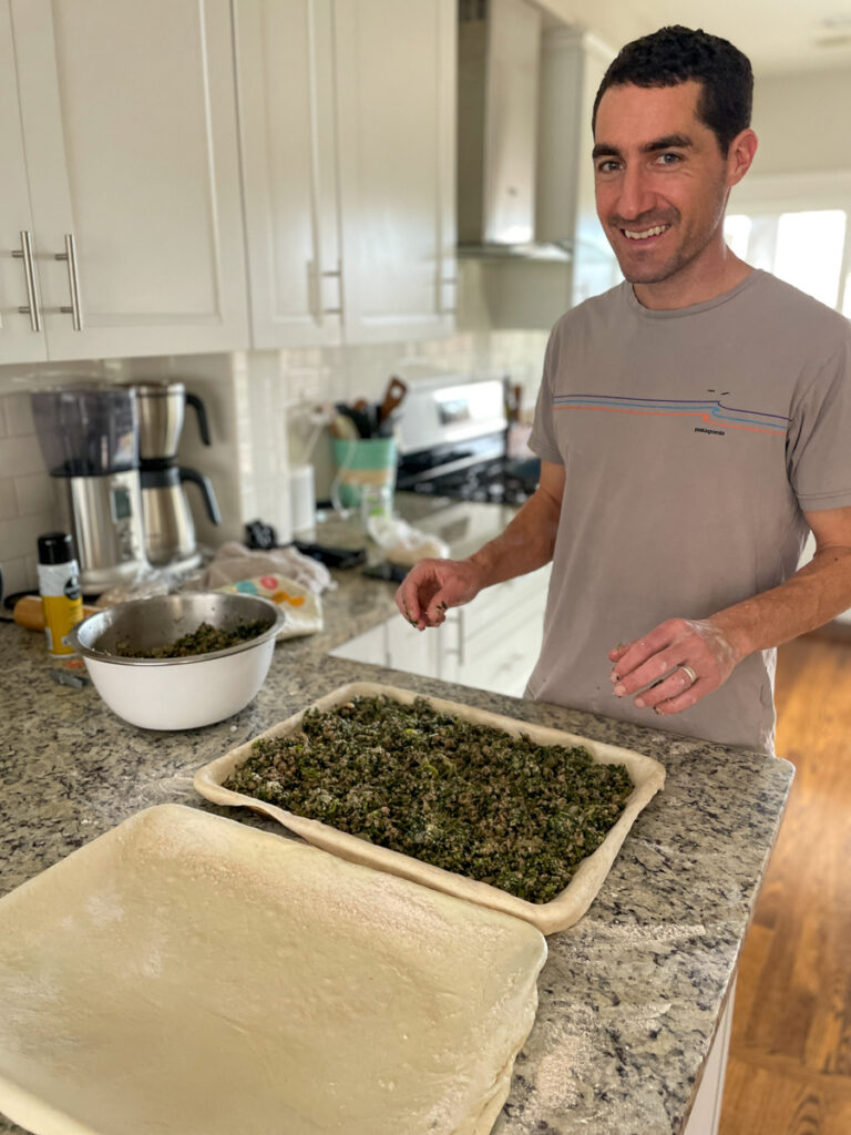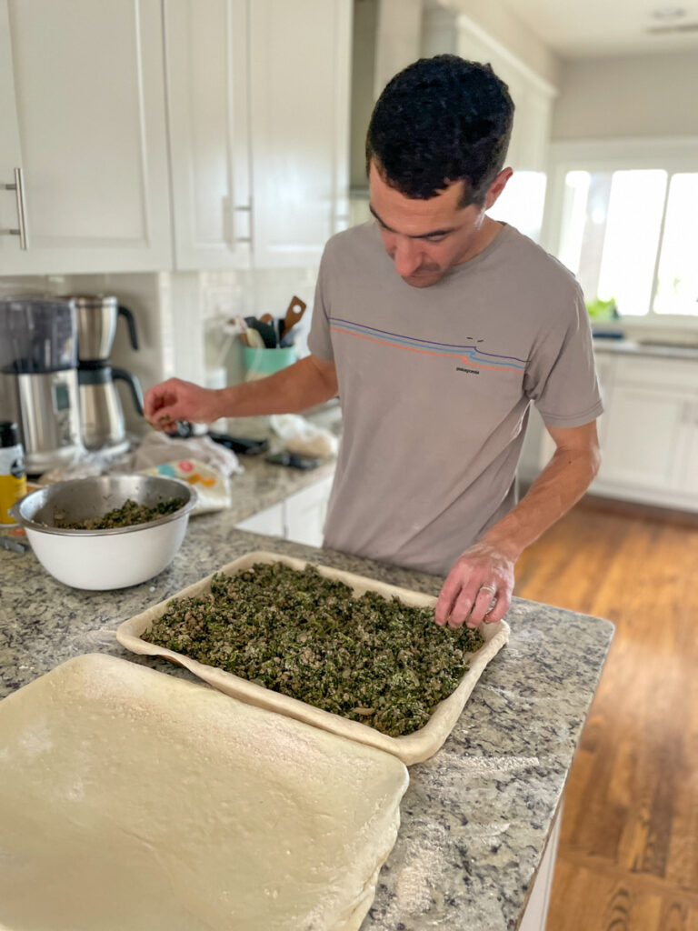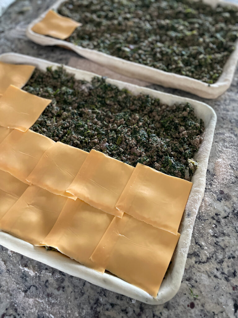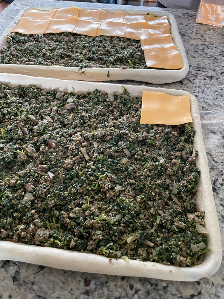 The base of the recipe is ground beef, frozen spinach, onions (yes onions!) and American cheese that melts so well right under the top layer of crust. While you certainly could make your own dough, our family buys pre-made dough from Whole Foods that we think is quite delicious! John mentioned that he often adds a container of mushrooms (sautéed with the onions) and extra parmesan cheese sprinkled into the top layer of his pizza for extra flavor.