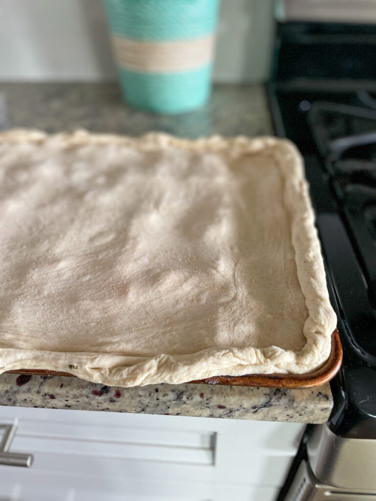 Roll out one of the packages of dough in a rectangle shape to fit the pan. Use flour on the countertop so it won’t stick. It’s better to have too much than too little. You don’t want the crust to be too thick but too thin and it will tear. You can cut off the excess on the edges after you put the second piece on top.
