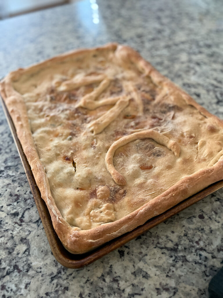 Roll out second package of dough in the same shape and fold over once and then twice so it is easier to pick up and place on the filling. Then open up to cover all the filling. Pinch it around the edges with only about 1/4 inch crust because it will double in size when it cooks. You don’t want too much crust. So you will need to cut extra dough around the edges of the pan as you go around the edges.