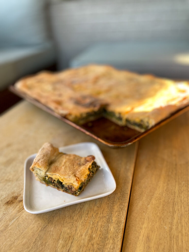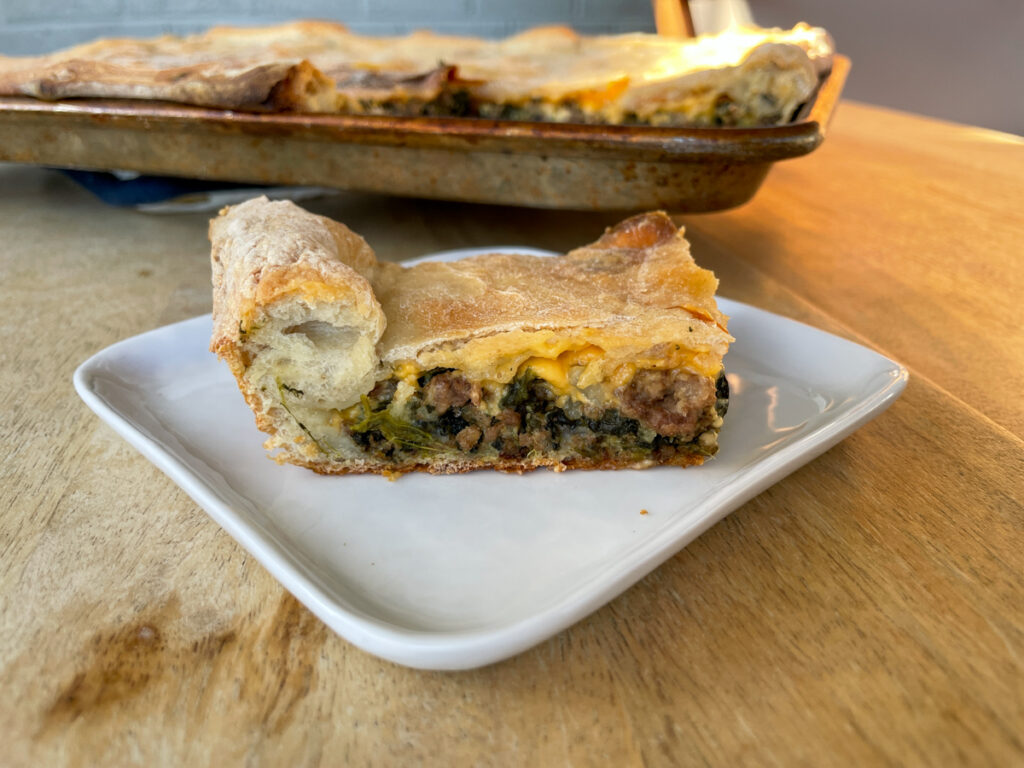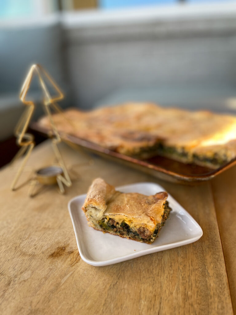 When I went to my first Christmas at the Donne’s house, everyone was talking about Christmas pizza. As this was not a tradition in my house, I wasn’t sure what type of pizza to expect. This is not your typical triangular New York slice; rather, it’s a deep dish stuffed pizza filled with ground beef, spinach, and gooey, melted cheese.