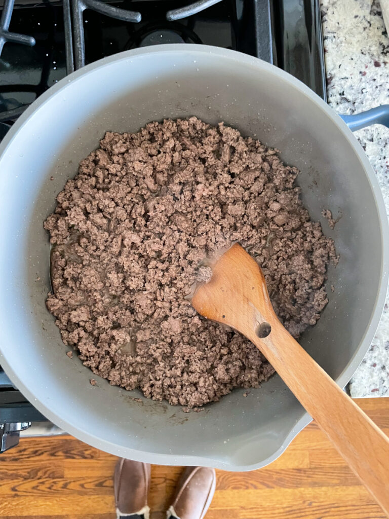 - Brown the meat in a skillet over medium with olive oil and add salt and pepper to taste. Put cooked meat in a colander to drain out the liquid - very important step!