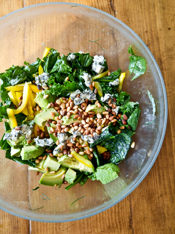 This salad was the best thing I had all week! Probably because I put the most effort into it : ) I snipped a bunch of kale and herbs (dill + basil) from the garden and then massaged them in sesame oil, rice wine vinegar and smoked sea salt. I added yellow bell pepper, avocado and delicious blue cheese plus heavily toasted pine nuts. Epic!!