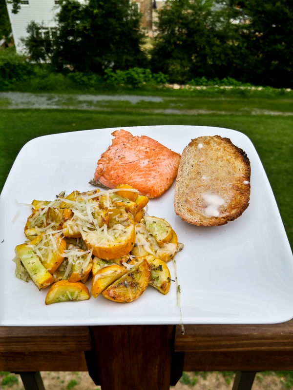 And finally, we had this dinner last night – simple sautéed salmon with squash cooked in herbs de provence and topped with shredded parmesan. Tuscan Sourdough bread on the side! That squash was so good!!