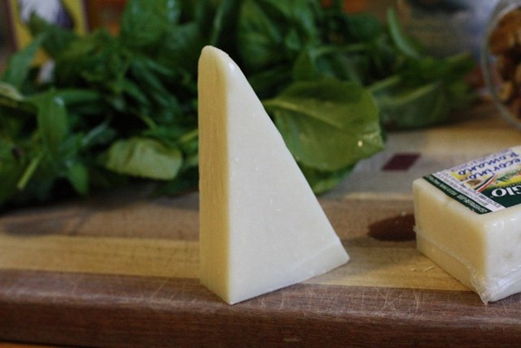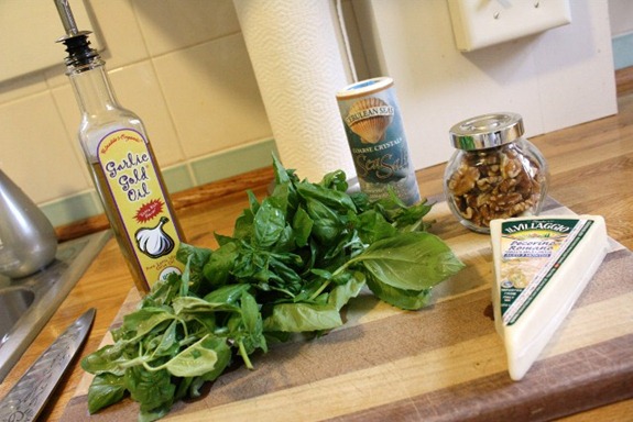 I always use Romano over parm in my pesto. Also this time I used pine nuts vs. walnuts.