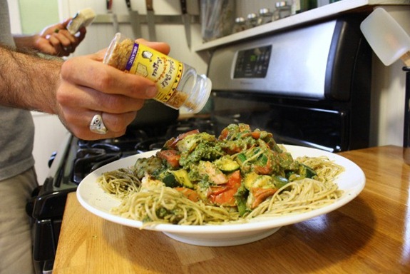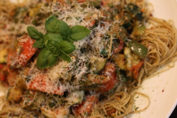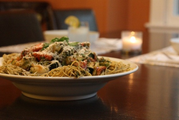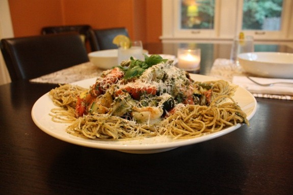 Pesto Shrimp + Veggies over Whole Wheat Angel Hair