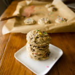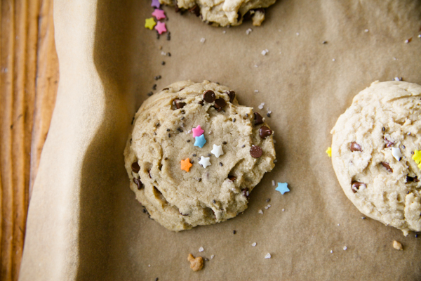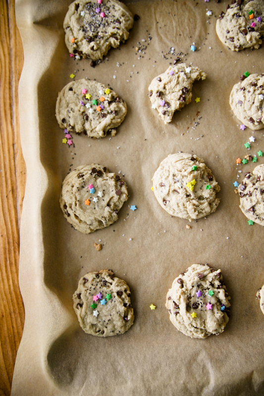 - Top each slightly-flattened cookie with sprinkles of your choice and a little sea salt.