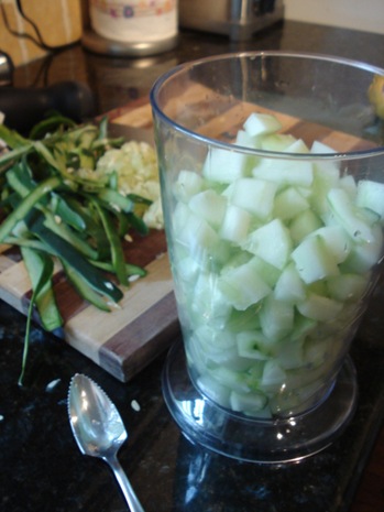 Coming back steamy from my walk, I wanted to try a new Chilled Cucumber Soup recipe. There are a few secret ingredients here, but it’s mostly cucumber and yogurt –