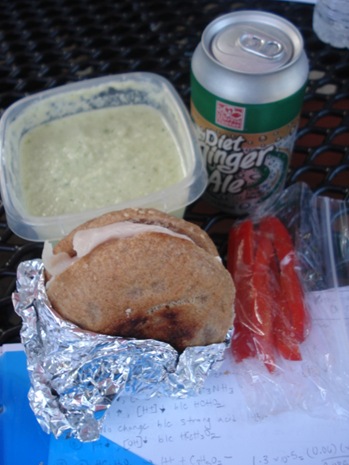 I also had a bagel sandwich with turkey, Laughing Cow, mustard and basil –