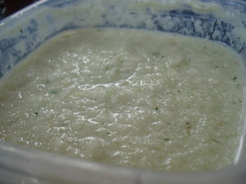 My picnic version. It tasted great to begin with, but like most chilled soups, I think my portion was too large. You have to sip them no more than a cup at a time or it gets to be too much!