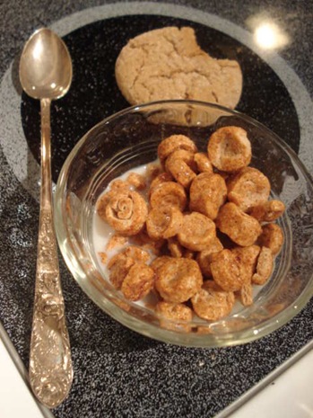 My stomach still feels funny – like there’s a gas ball in it or something!! All day I can tell I’m hungry, but I don’t get the normal hunger pangs. On my way home from chem, I could tell I really needed a snack and couldn’t decide between cold cereal (my favorite late-night snack besides ice cream) and a molasses cookie. So I had half cereal and a cookie. I took a bite first – I couldn’t wait!
