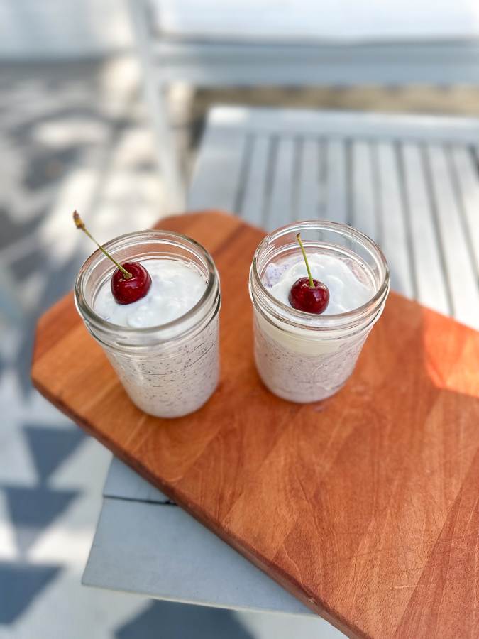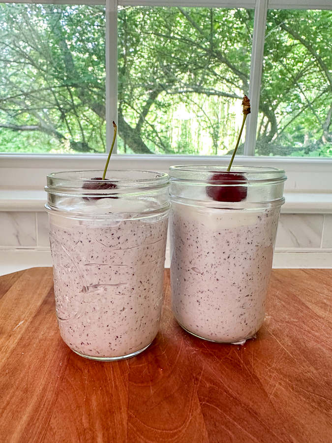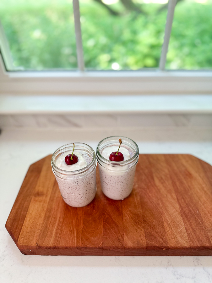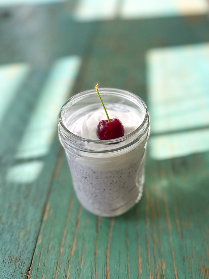 - Portion into jars or glasses, evenly distribute remaining coconut whip, and top with fresh cherries.